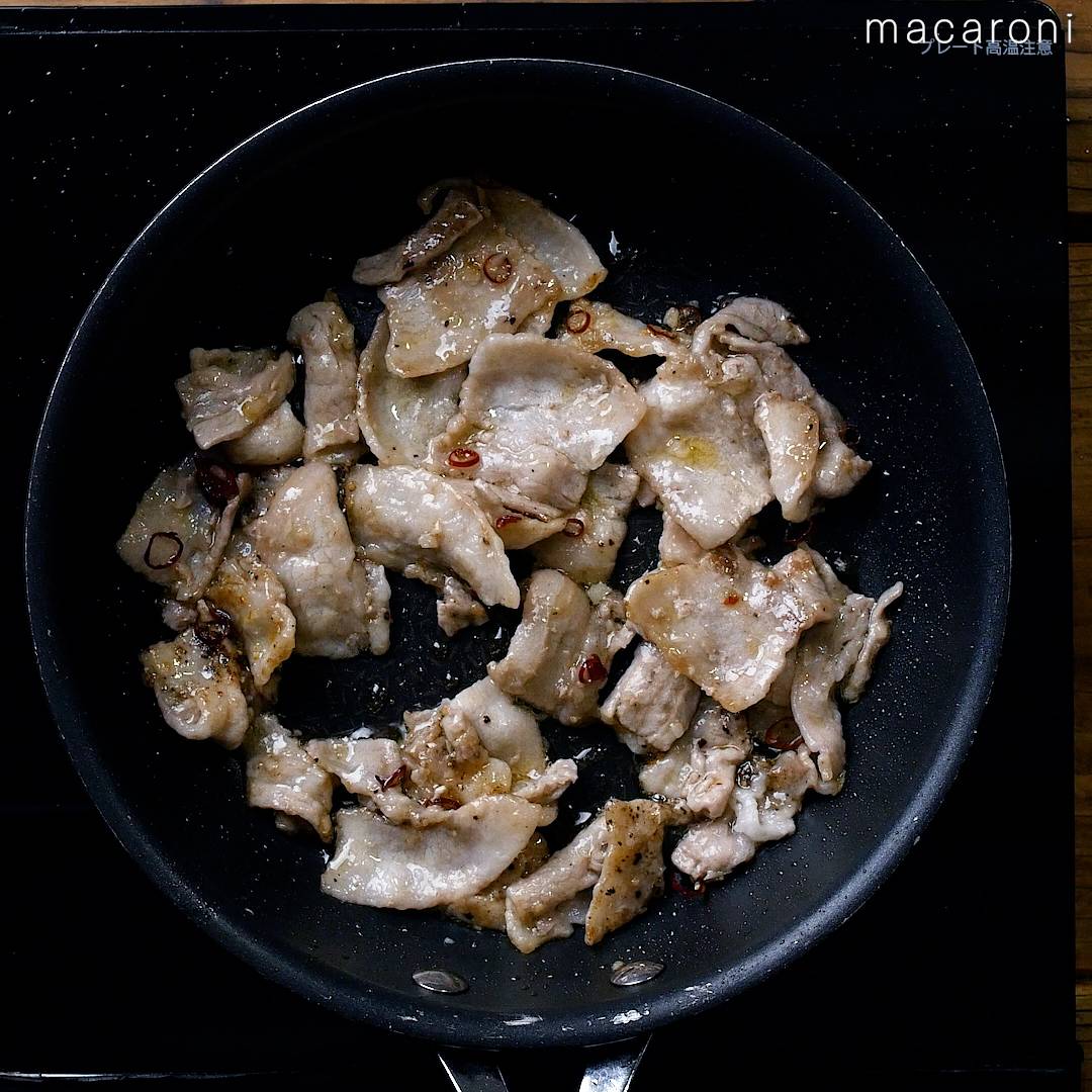 4: 香りが出てきたら豚バラ肉を加え、カリッとするまで炒めます。