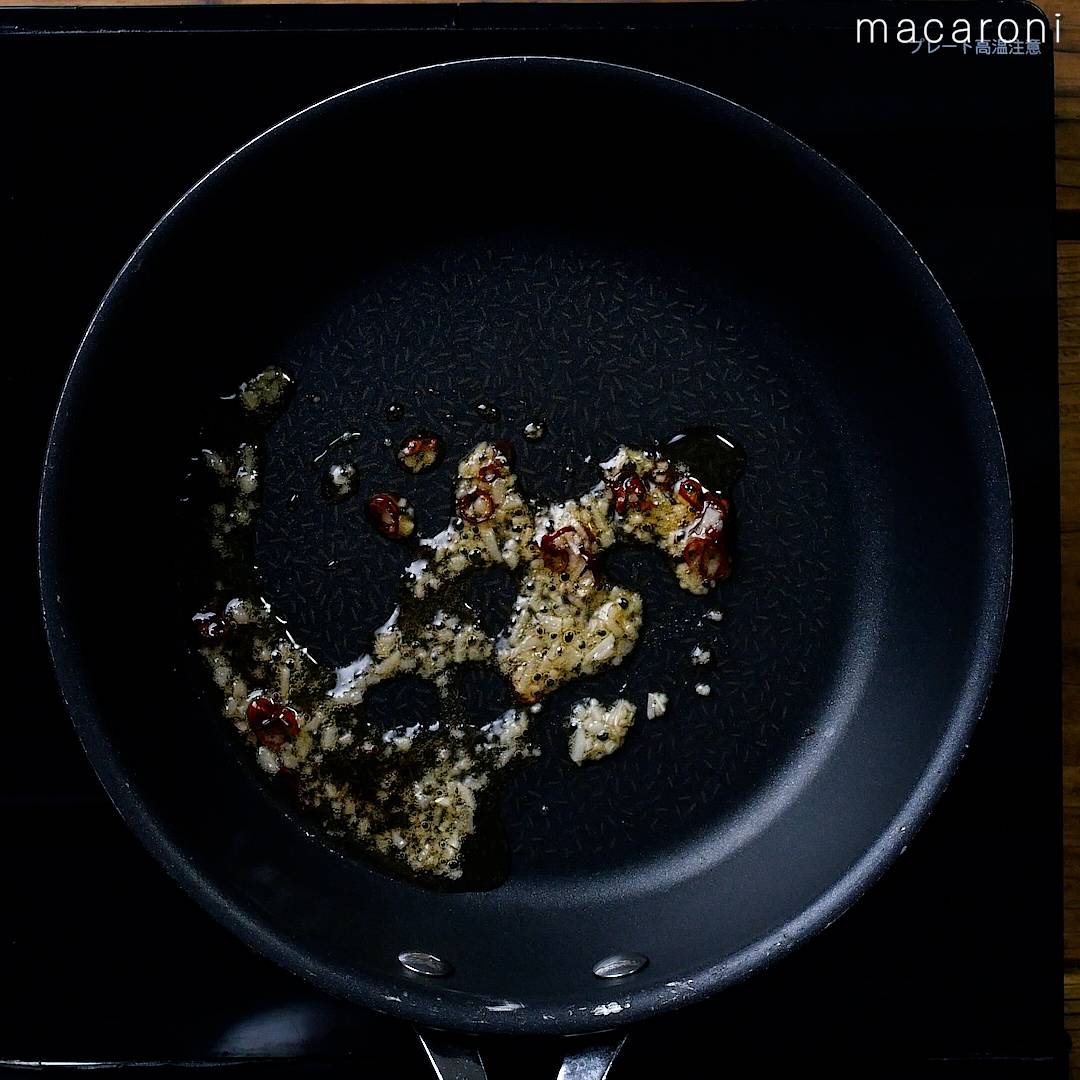 3: フライパンにごま油を引き、にんにく、輪切り唐辛子を入れて弱火で加熱します。