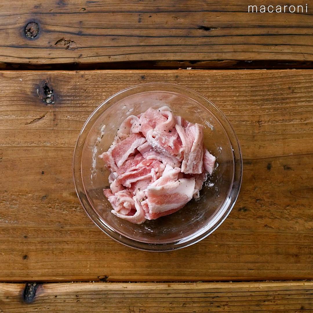 2: 豚肉は酒、黒こしょう、片栗粉で下味をつけます。