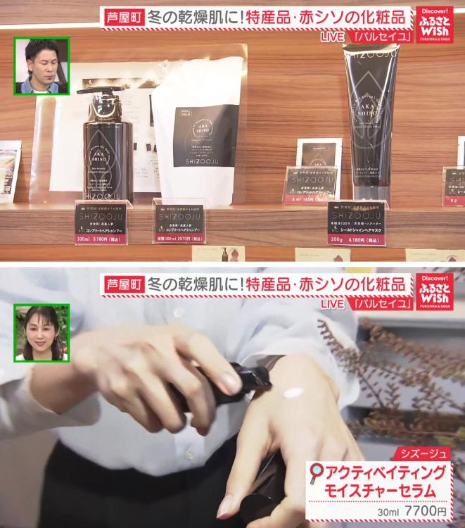 『パルナチュレ』では、芦屋町特産の「赤シソ」を使ったオーガニック化粧品も取り扱っています。特許を取得した赤シソエキスを配合したオリジナルブランド「シズージュ」シリーズは、シャンプーからスキンケアまで約60種類も。