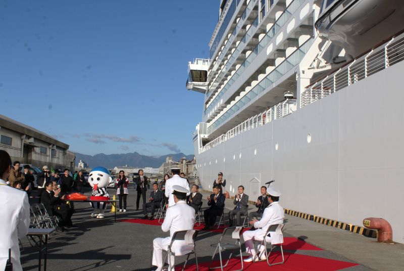 飛鳥Ⅲの初代船長である小久江尚船長がお礼のあいさつをし、「寒い中を初入港にかけつけていただき、ありがとうございます。きょうは、クルーたちも四日市の街を楽しませていただきます。飛鳥Ⅱの寄港の数を超えられるよう、やっていきたいと思っています」と話した。