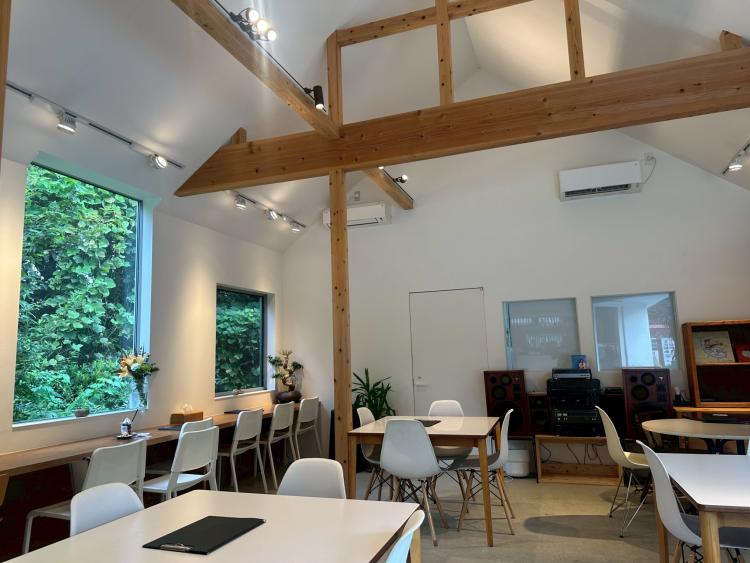 店内に入ると、高い天井と大きな窓が広がり、木々の緑と青空が一望できます。