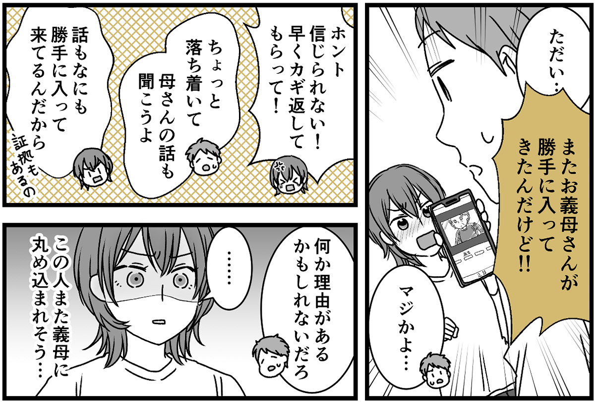 私は夫が帰ってくるなり、「またお義母さんが勝手に入ってきたんだけど!」と言って、玄関モニターの履歴を見せました。さすがの夫も呆れています。しかし、夫は「何か理由があるかもしれないだろ」と、義母を庇うように言います。こんな調子なので、また夫と義母の2人で話しても夫は義母に丸め込まれそうです。