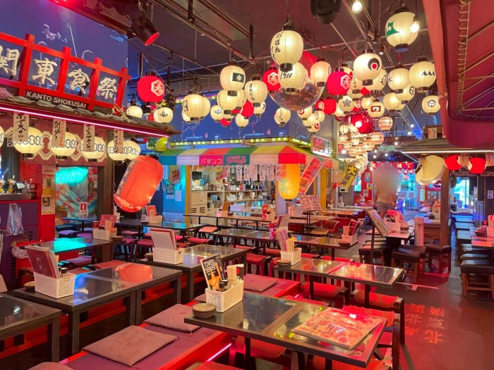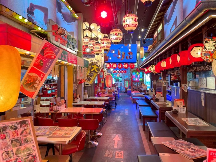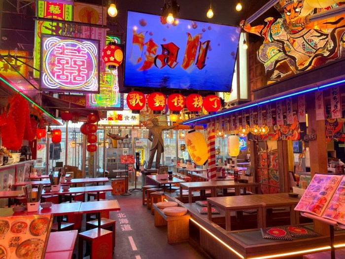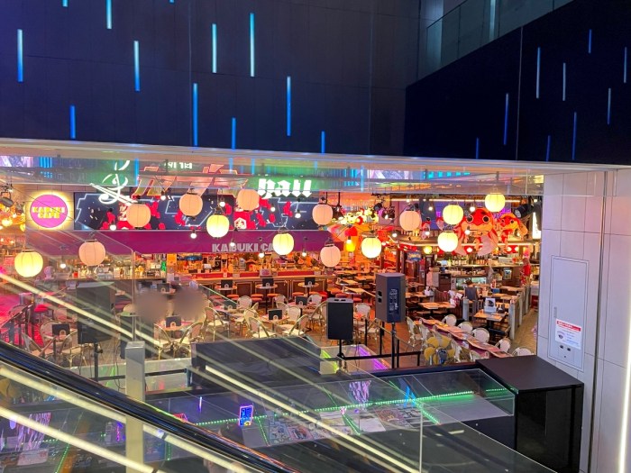 それでは入場してみよう。タワー2階は「新宿カブキhall~歌舞伎横丁」という横丁スタイルの飲食施設になっており、ギラギラした内装の飲食店が10店舗並ぶ。