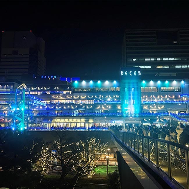 デックス東京ビーチの外観もライトアップを実施。こちらの施設は、館内のいたるところに、“船”を思わせる装飾を施しているのが特徴。