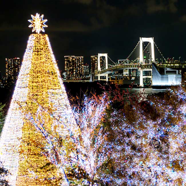 東京湾の夜景とレインボーブリッジを背景にイルミネーションを鑑賞できるから、デートで訪れるのにもおすすめ。大切な人と一緒に、光に満ちたロマンティックなひとときを過ごしてみては。