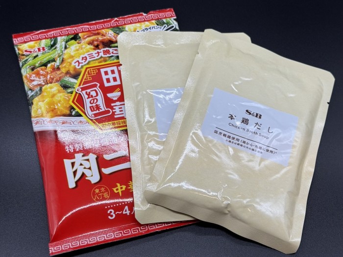 時短調理にお役立ちの「町中華 肉ニラ玉の素」は税込170円。「本鶏だし」はスーパーでは見かけない商品で、公式通販サイトでは8袋で税込2160円なので、1袋270円って感じかな。ここまでは全アイテム1点ずつなのだが、「本鶏だし」のみ2点入っている。