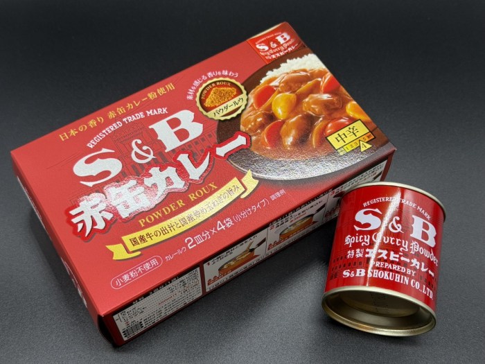 まずは「赤缶カレーパウダールウ 中辛」と「カレー 37g」が登場! 後者のシンプルすぎる商品名、「表記ミス?」と思ってしまうがそうではない。エスビーの看板商品と呼んでもいい昭和レトロな「赤缶」は、「カレー ○○g」が正式名称なのだ。孤高にして唯一、歴史に裏打ちされた矜持を感じる。