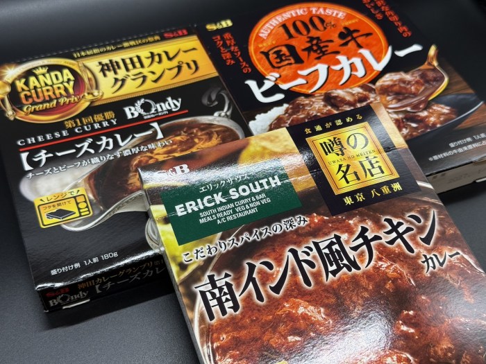 自炊したくない日にありがたいレトルトカレーたち。「神田カレーグランプリ 欧風カレーボンディ チーズカレー」「国産牛ビーフカレー 中辛」「噂の名店 南インド風チキンカレー」。