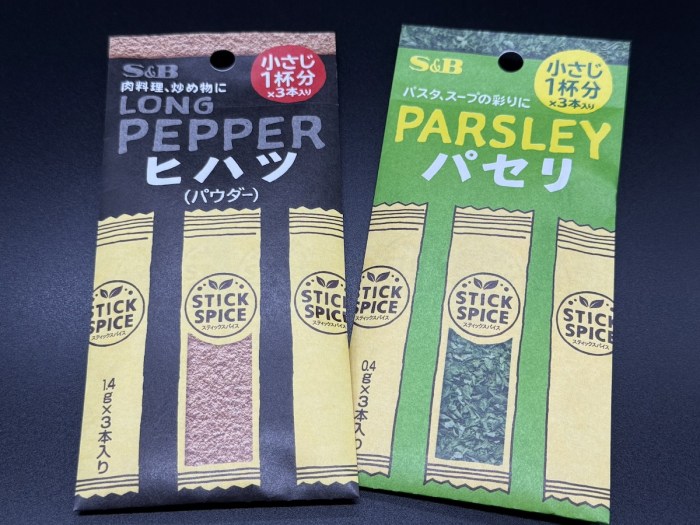「スティックスパイス ヒハツ」「スティックスパイス パセリ」は筆者は初めて見る。計量いらずで小さじ1杯分のスパイスが入っているらしい。スーパーには見当たらなかったが、公式通販サイトで税込213円。