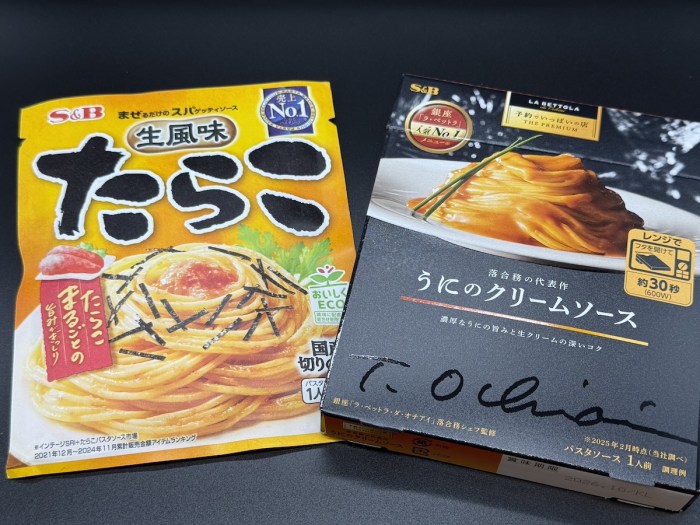 定番中の定番「まぜるだけのスパゲッティソース 生風味たらこ」と、ワンランク上のプレミアムライン「予約でいっぱいの店 THE PREMIUM うにのクリームソース」。