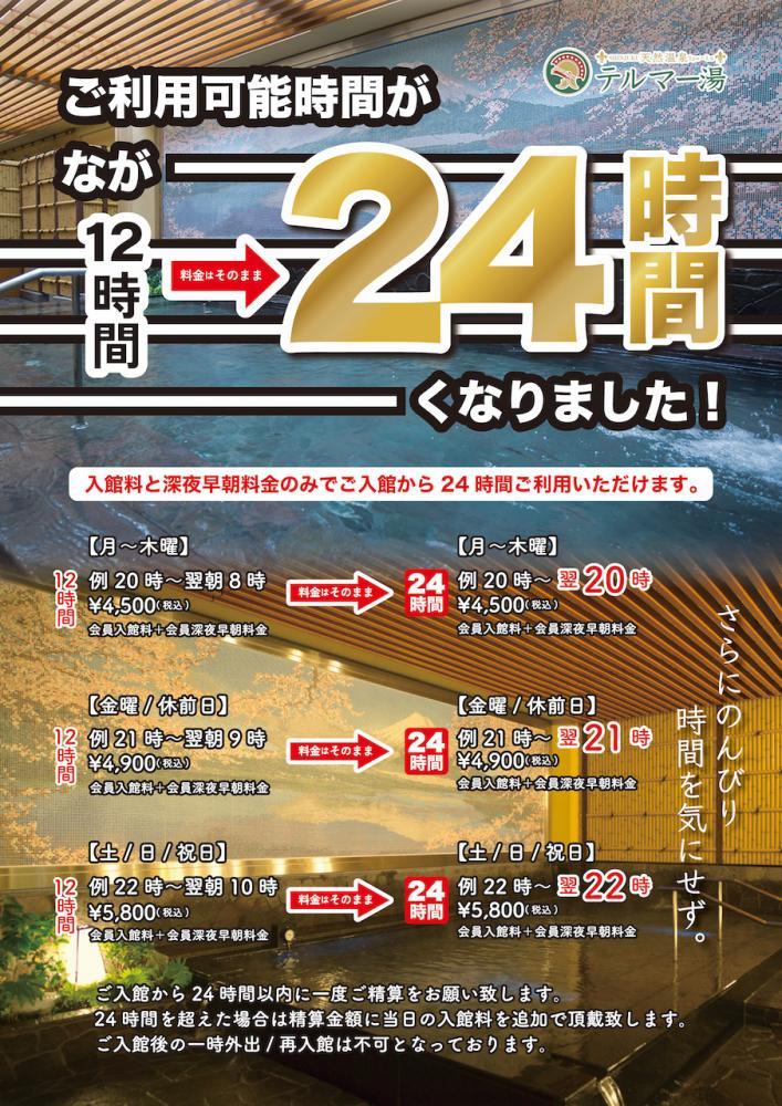入館料金のみで朝6時から深夜24時までの利用が可能になり、最大18時間の長時間滞在にも対応。