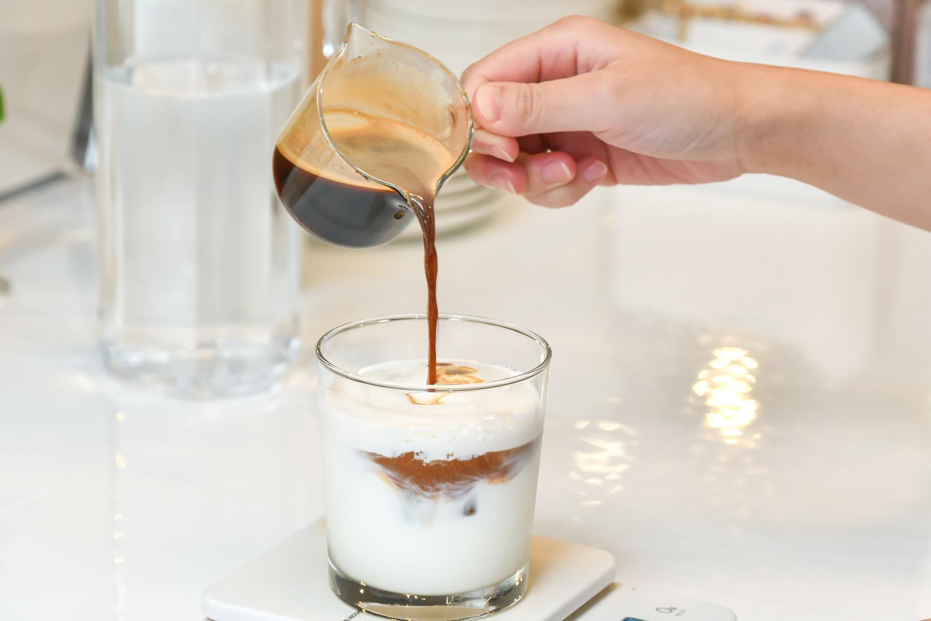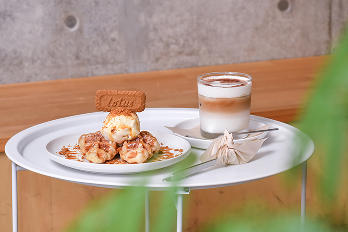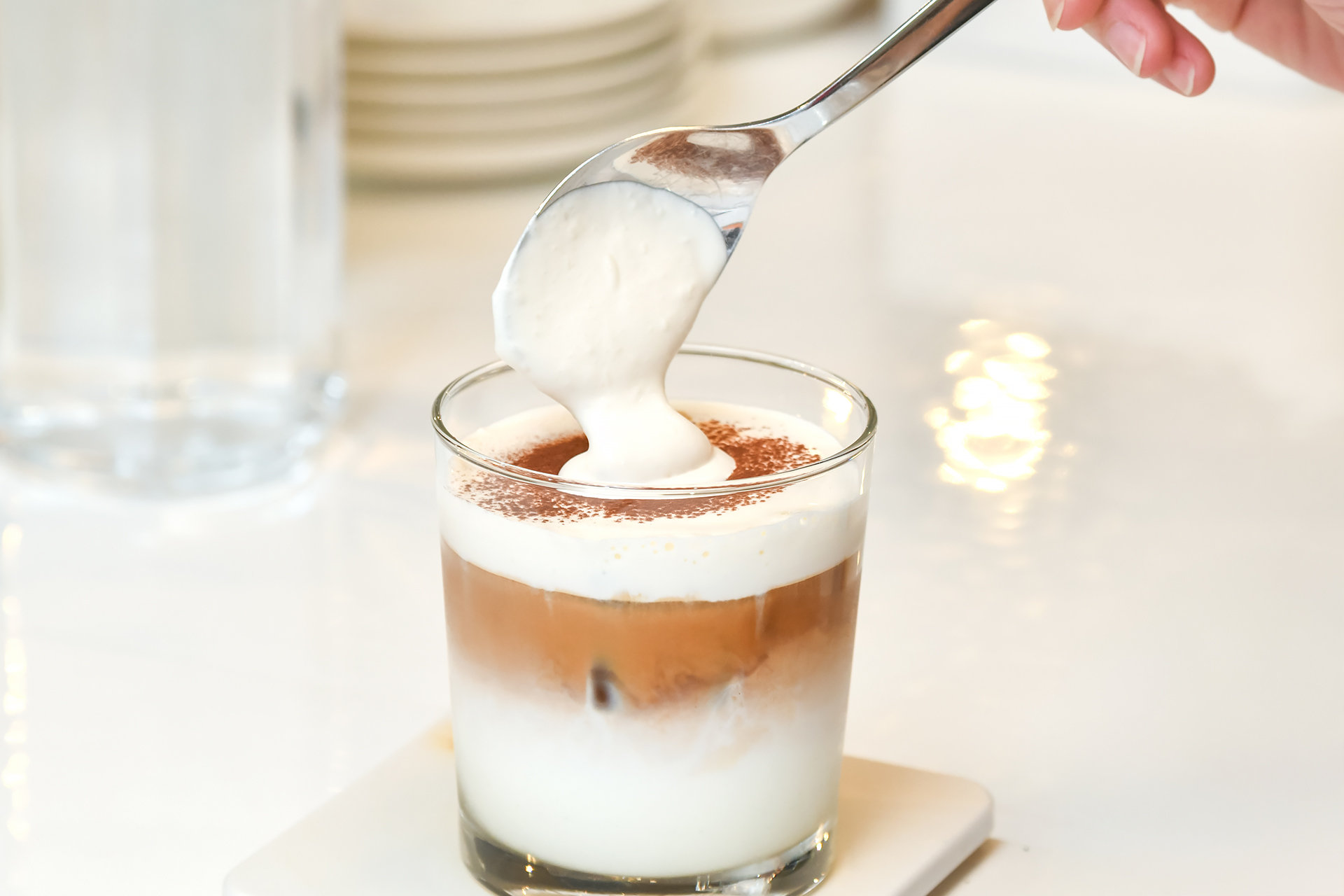 仕上げにたっぷりとのせられた生クリーム。そのまますくえば、ふわっと軽やかな甘さが楽しめる。それからエスプレッソと混ぜて、味の変化を楽しむのもおすすめ。また、クロッフルについてくるクッキーですくう人も多いそう。