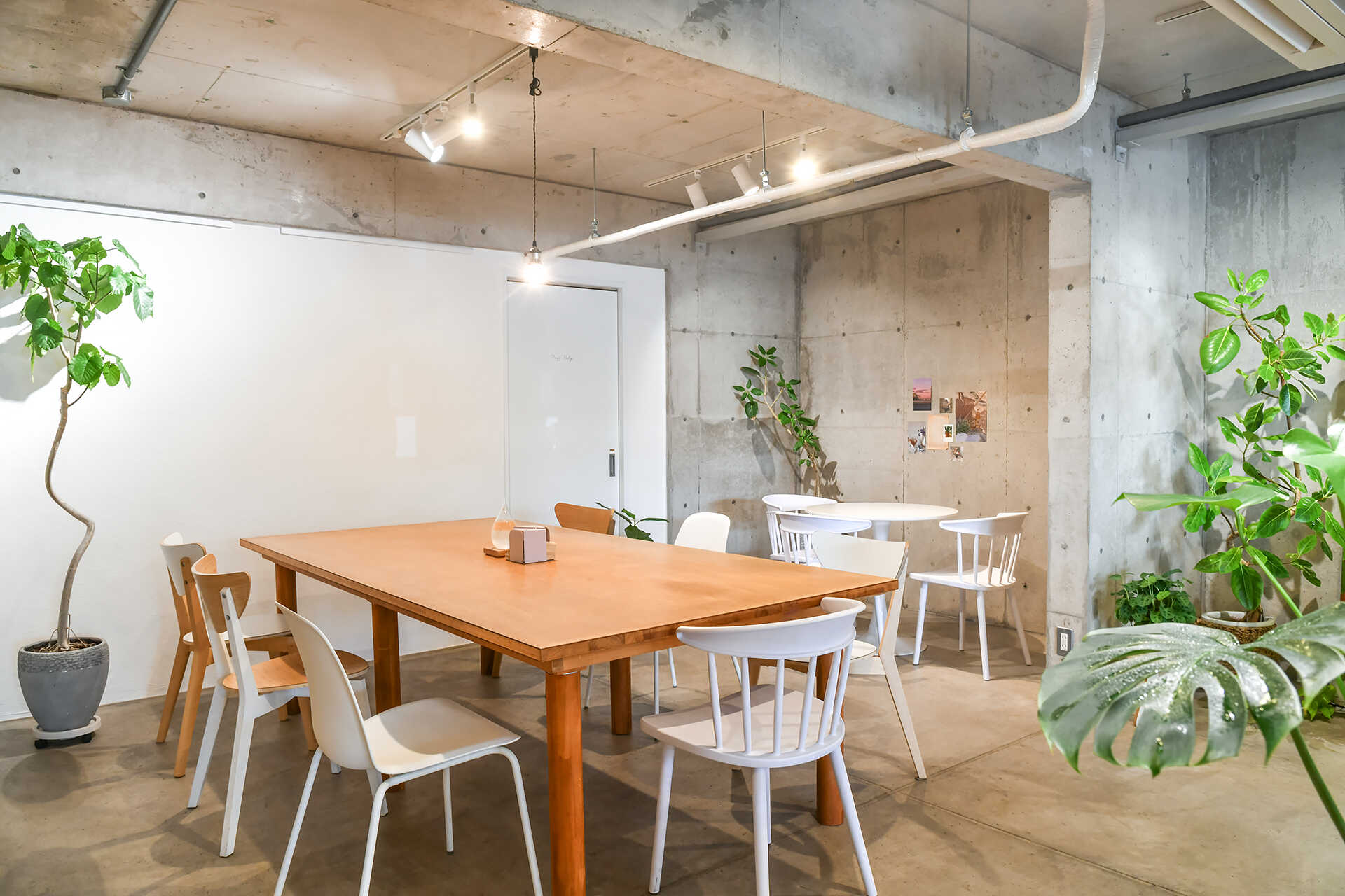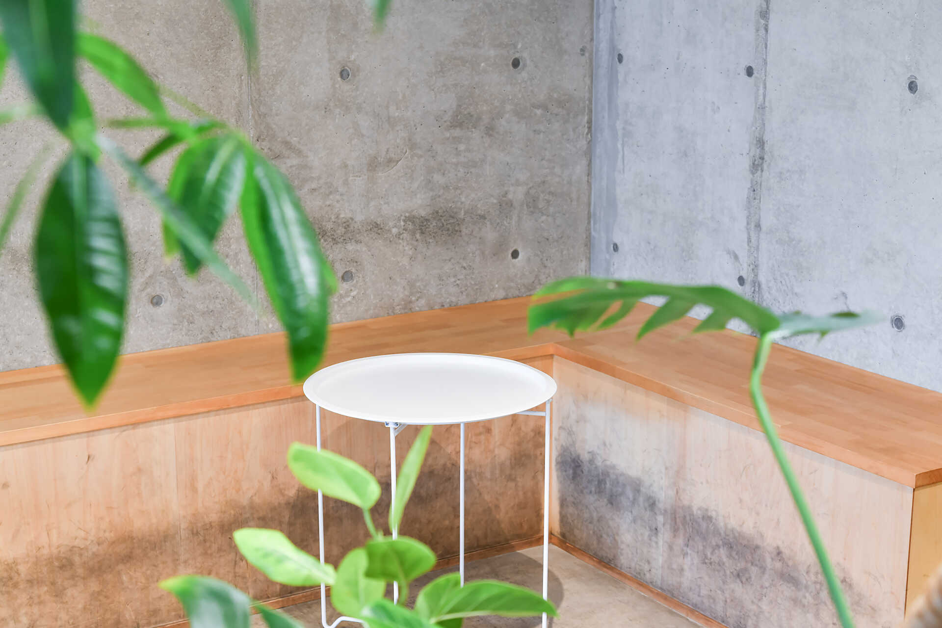 東映太秦映画村からすぐ、コンクリートの外壁が存在感を放つ建物の1階にあるカフェ。店内は、無機質な打ちっぱなしのコンクリートに、ナチュラルウッドや白いファニチャーがやわらかく調和。ミニマルで洗練された空間に自然光が差し込み、観葉植物の緑が穏やかな彩りを添えている。