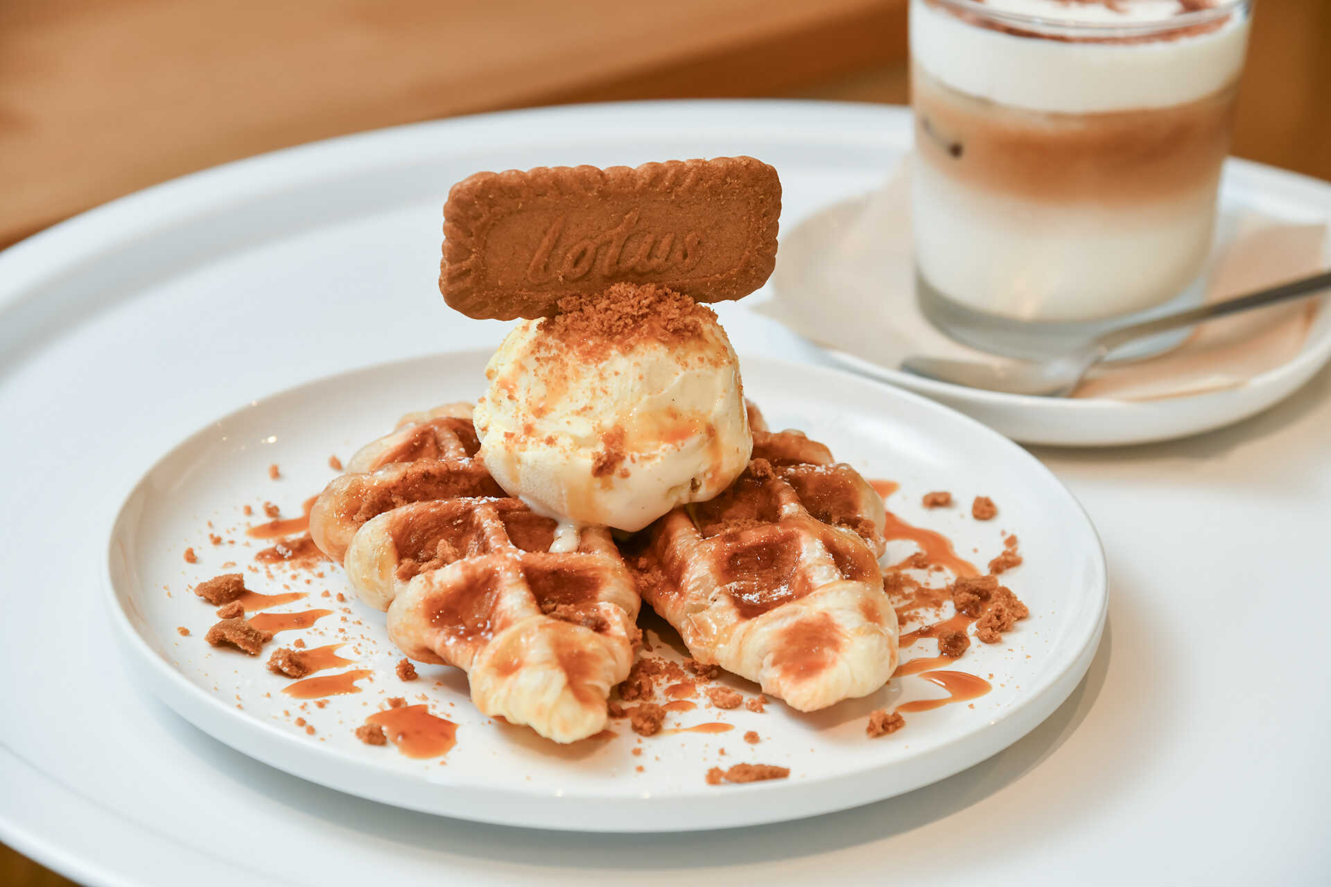 焼きたてサクサク。香ばしいキャラメルクロッフルに、とろけるバニラアイスを添えて