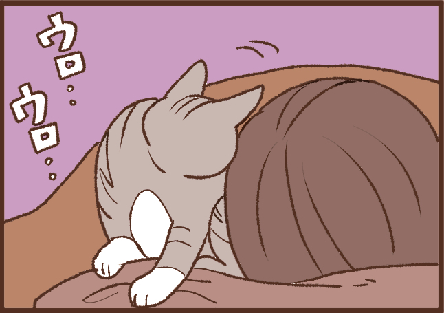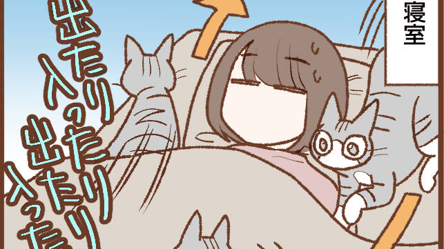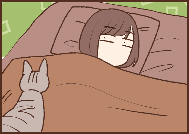 ニナちゃんやリンちゃんが布団に入ってきて、なぜかそのまま下から出て行くことは たまにあったのですが、トトがUターンして逆側に入ろうとしてきたのは初めてで、ちょっと面白くて描いてみました(笑)