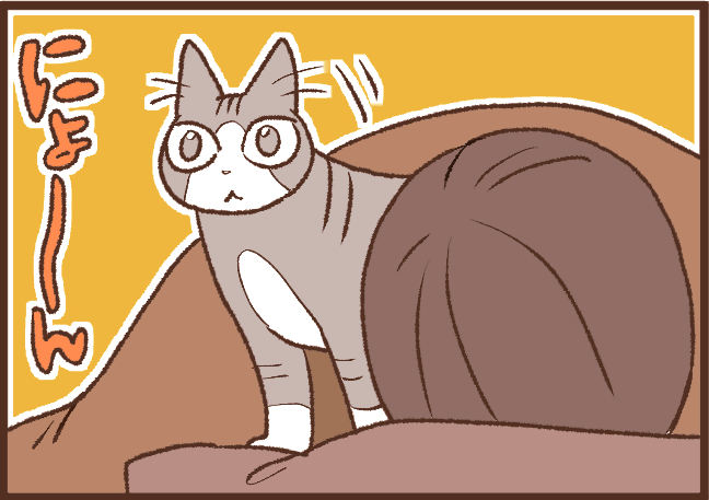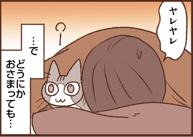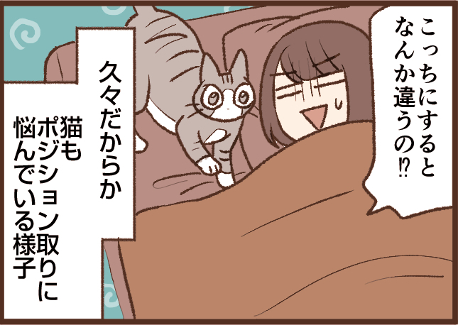 しかし本当にベストポジションに落ち着くまでが長い!!(笑) ああでもない、こうでもないとグルグルした挙句に出て行ったりもするので、どっちかにしてくれ……という気持ちになりつつも、こうして入ってくるとやっぱりうれしい季節の風物詩、猫ふとん……。