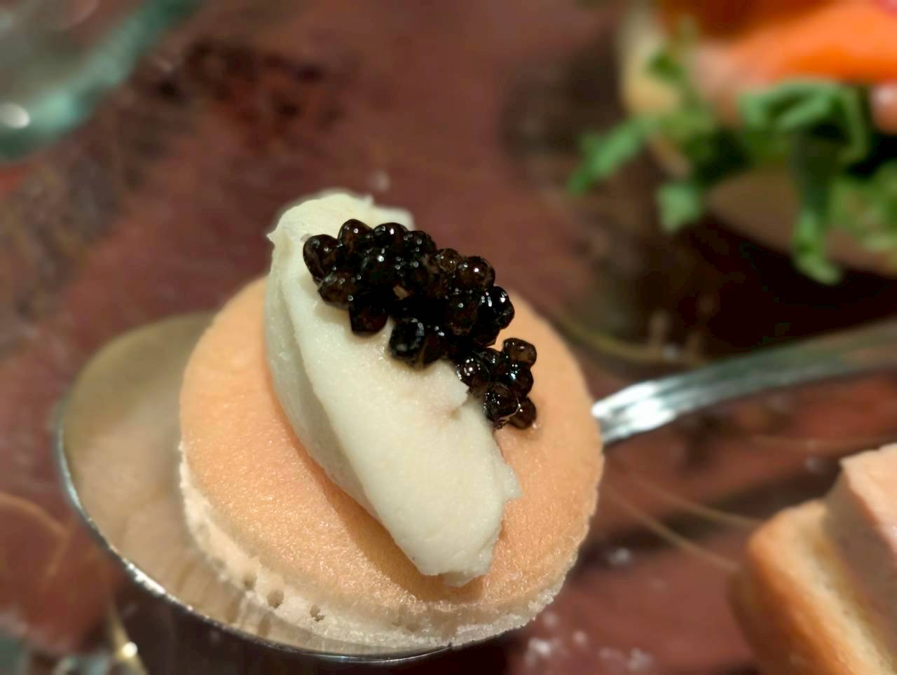 スモーキーな香りがふわりと立つパンケーキの上には、なめらかなジャガイモのムースとキャビア。
