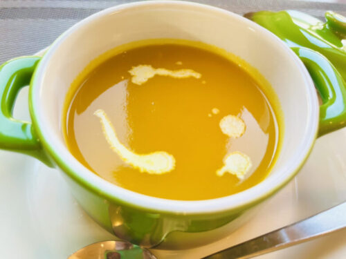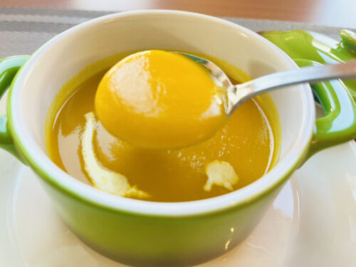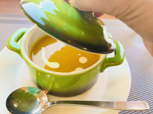 そしてこちらが、大人気の「自家製かぼちゃのスープ」。(税込400円) スープは旬の素材を使用するため季節によって変更します。ちなみに「かぼちゃスープ」は、年内中の提供予定。