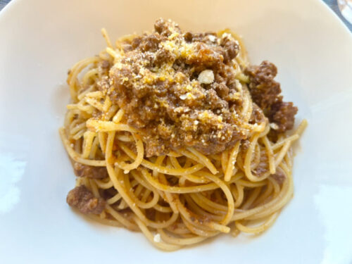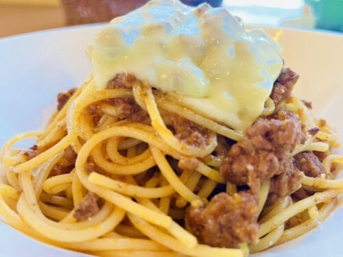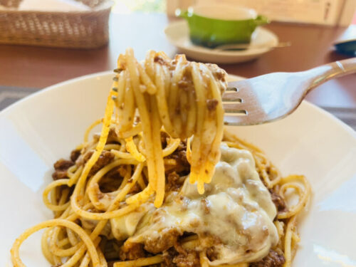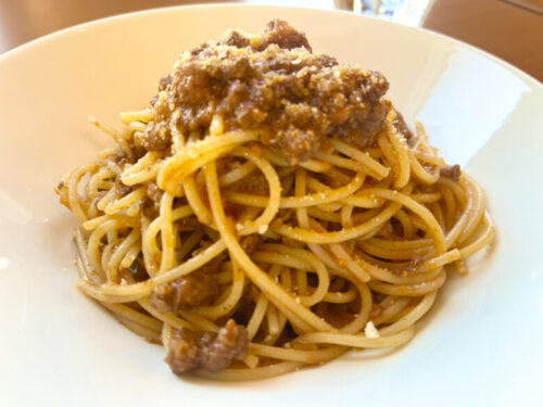 上から見ると特に、ミートソースのお肉がゴロゴロたっぷりと入っていることがよく分かります。