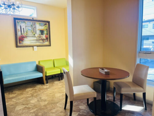 ドアの前にはライムグリーンと鮮やかなブルーの椅子が並んでいて、静かで心落ち着くBGMが流れていました。