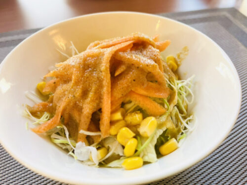 シャキシャキの新鮮なサラダ(税込280円)には、程よい酸味を感じるさわやかで優しい味の自家製ドレッシングが添えられていました。