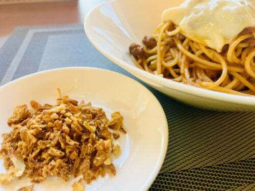 フライドオニオンのザクザクッとした食感と香ばしさが加わって、より深いコクと甘みを感じられる逸品に。 老若男女問わず愛されること間違いなしの「ミートソース」でした!