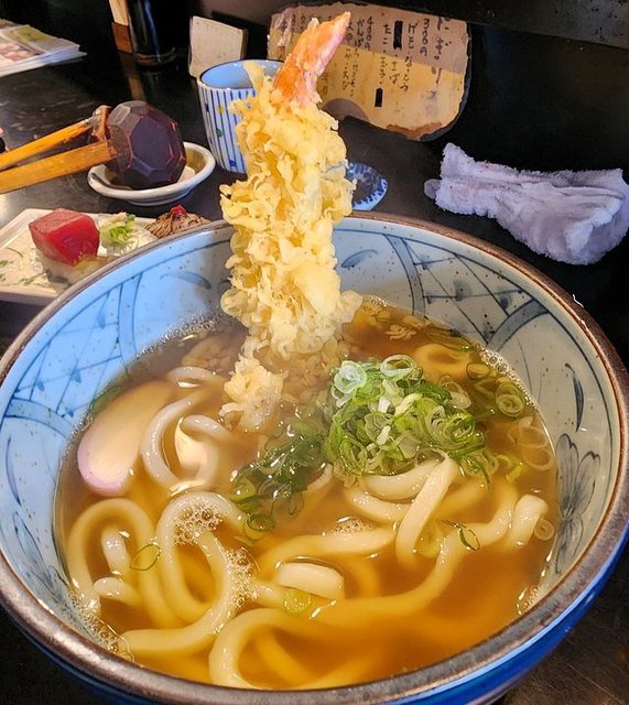 相方は海老天¥250をトッピングした「海老天うどん」をお願いしたのですが、ダシが旨いのは共通。このサイズの海老天が¥250とはちょっとびっくりだよねえということに。繰り返しますが、大盛無料!