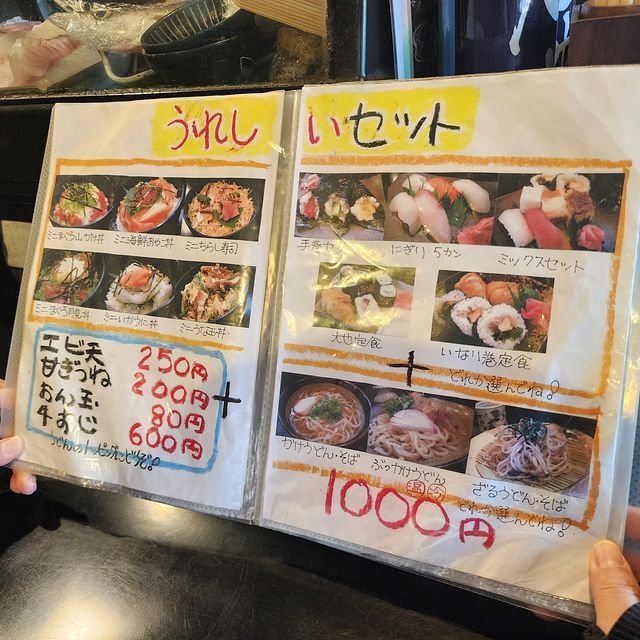 ランチ時は、お寿司やミニ丼にうどん・蕎麦が付いた「うれしいセット」が大人気。今どき¥1000で頑張っておられるのだ。更になんと、うどん・蕎麦の大盛りが無料で、トッピングも各種完備。周りを観察していると概ね「にぎり5貫セット」を注文されているわけで。