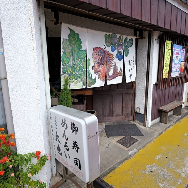 お店の名前は「大也鮨」(だいやすし)、看板に「御寿司・めんるい」とあるように、うどん・そばなどの麺類も出されている地元民が集まる寿司屋さんらしく、こりゃいかないと!と、もう1年ほど懸案にしていたお店。オープン時間が11:30で土日もランチOKなのだ。 で、オープン3分過ぎにお店に到着し、特に行列もなく、すんなり店内に。