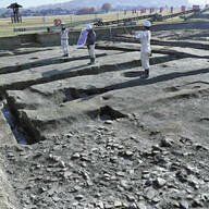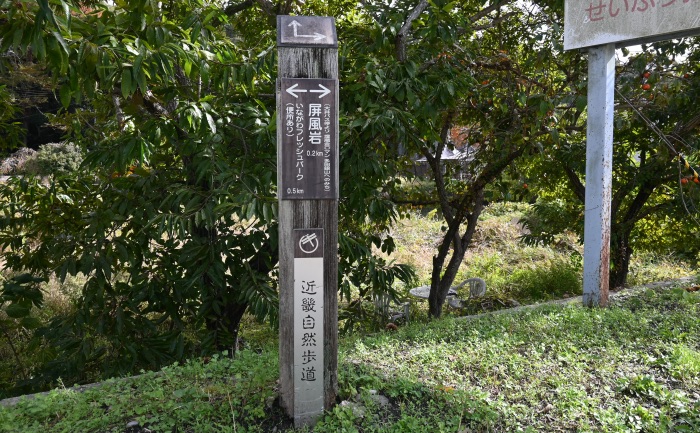 てくてくと田んぼ脇の歩道を歩きながら5分ほど。向かって左手に、岩壁がちらりと姿を現します。