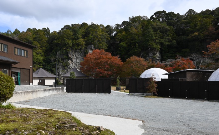 記憶の中で古い旅館があった場所には、新たにグランピング施設がオープンしていました。部屋によっては岩壁がすぐ目の前で、お金を払って絶景を堪能するのも悪くないな、と思いつつ先へ進みます。