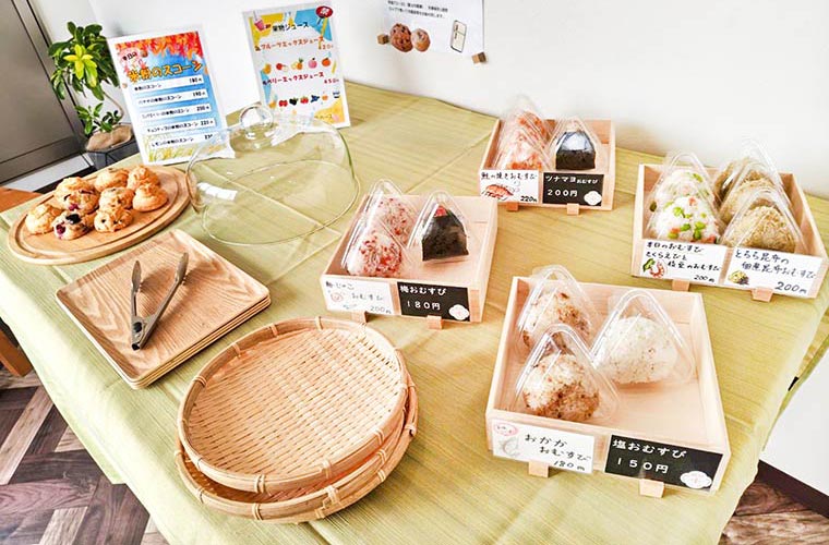 おむすびとスコーンは、カウンター横のテーブルにずらり。気軽にテイクアウトできるのも魅力です。