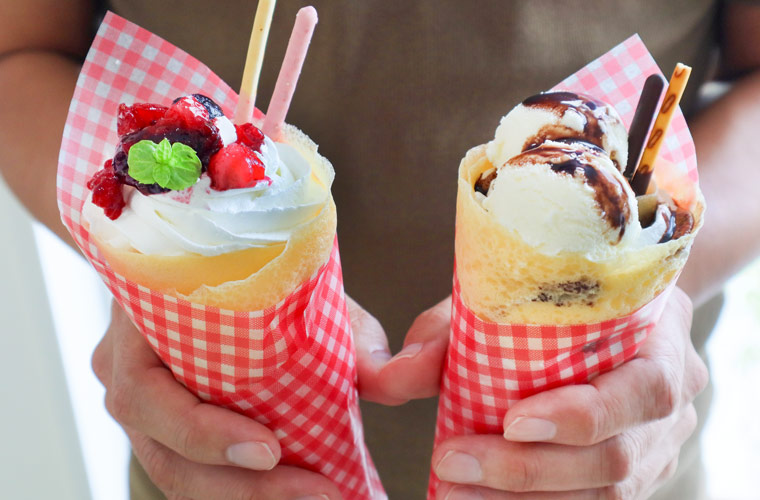 左から『ミックスベリーの米粉クレープ』430円、『チョコバナナのバニラアイス米粉クレープ』440円