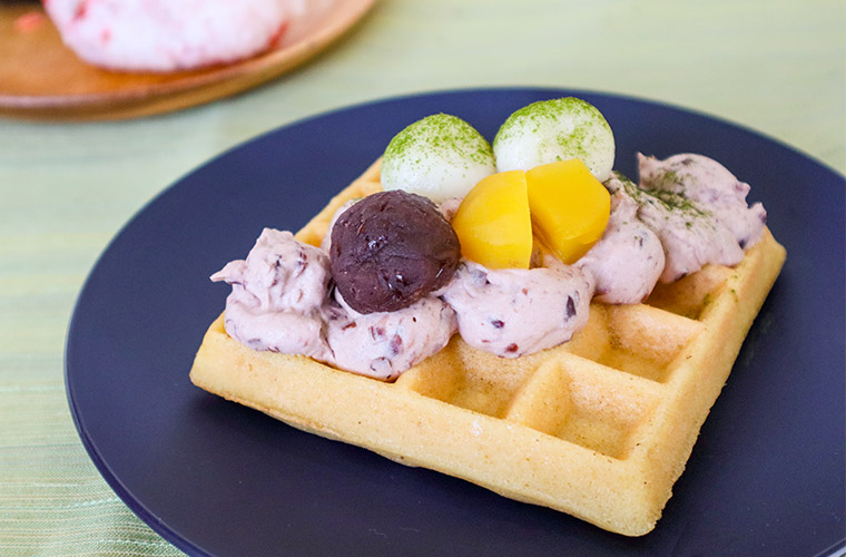 和スイーツ好きなら、『生あんと白玉団子の米粉ワッフル』はいかが?米粉ワッフルは、スコーンやクレープと同じくバターを使わずにあっさりとした味わい。粒あんはたつの市内の「森口製あん」のものを使用し、甘さ控えめで小豆そのものの濃厚な味を楽しめます。栗と白玉、ぱらりと振りかけられた抹茶のバランスが良く、これぞ“和の融合”といった味わいです。