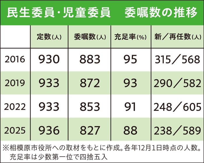 地域の高齢者や子どもの見守りなどを行う「民生委員」の3年に1度の改選が行われ、相模原では12月1日、計827人が委嘱された。世帯数や独居高齢者の増加でニーズが高まる一方、委嘱数は年々減少しており、今回は欠員109人。充足率は9割を下回り、成り手不足が深刻だ。民生委員が不足することによる地域への影響と、今後求められる対策を探った。