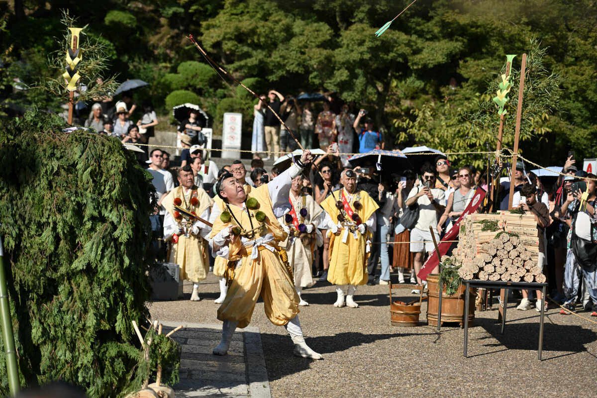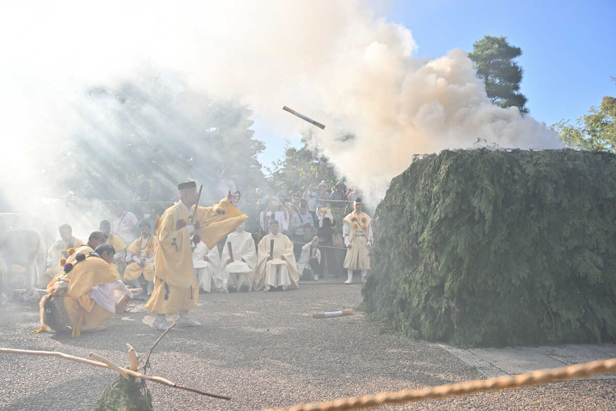 本物の山伏かどうか確認をする儀式「山伏問答」を皮切りに、弓や斧を用いた邪気を払う儀式や神職の祝詞奏上が続きます。やがて2万枚の「京の七夕」短冊の束が護摩壇の上に乗せられると、最後の祈願書が読み上げられ、長さ3mほどの松明で護摩壇の下の方から火が灯されました。