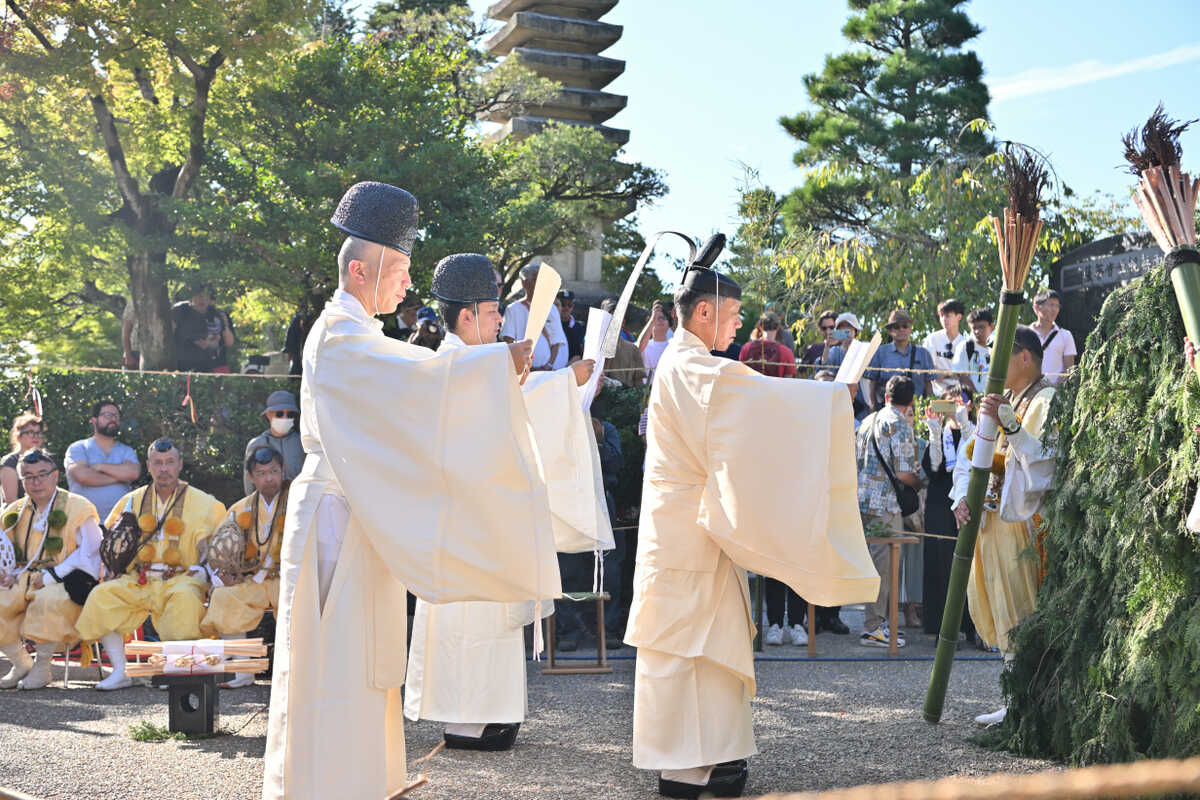 京都仏教会の主催で、聖護院門跡の山伏と僧侶、京都府神社庁の神職が共に祈る中、「京の七夕」の短冊も共に投じられます。