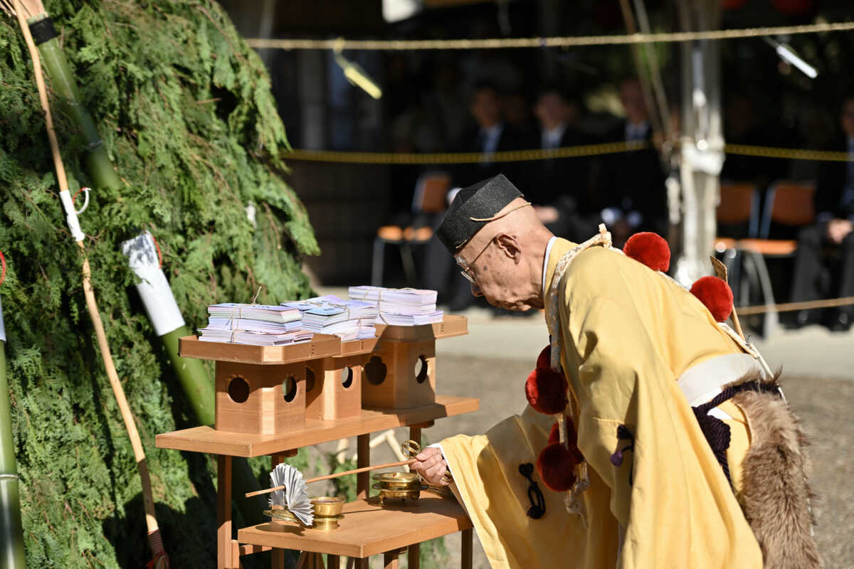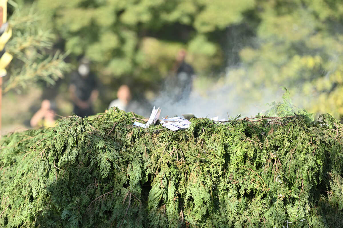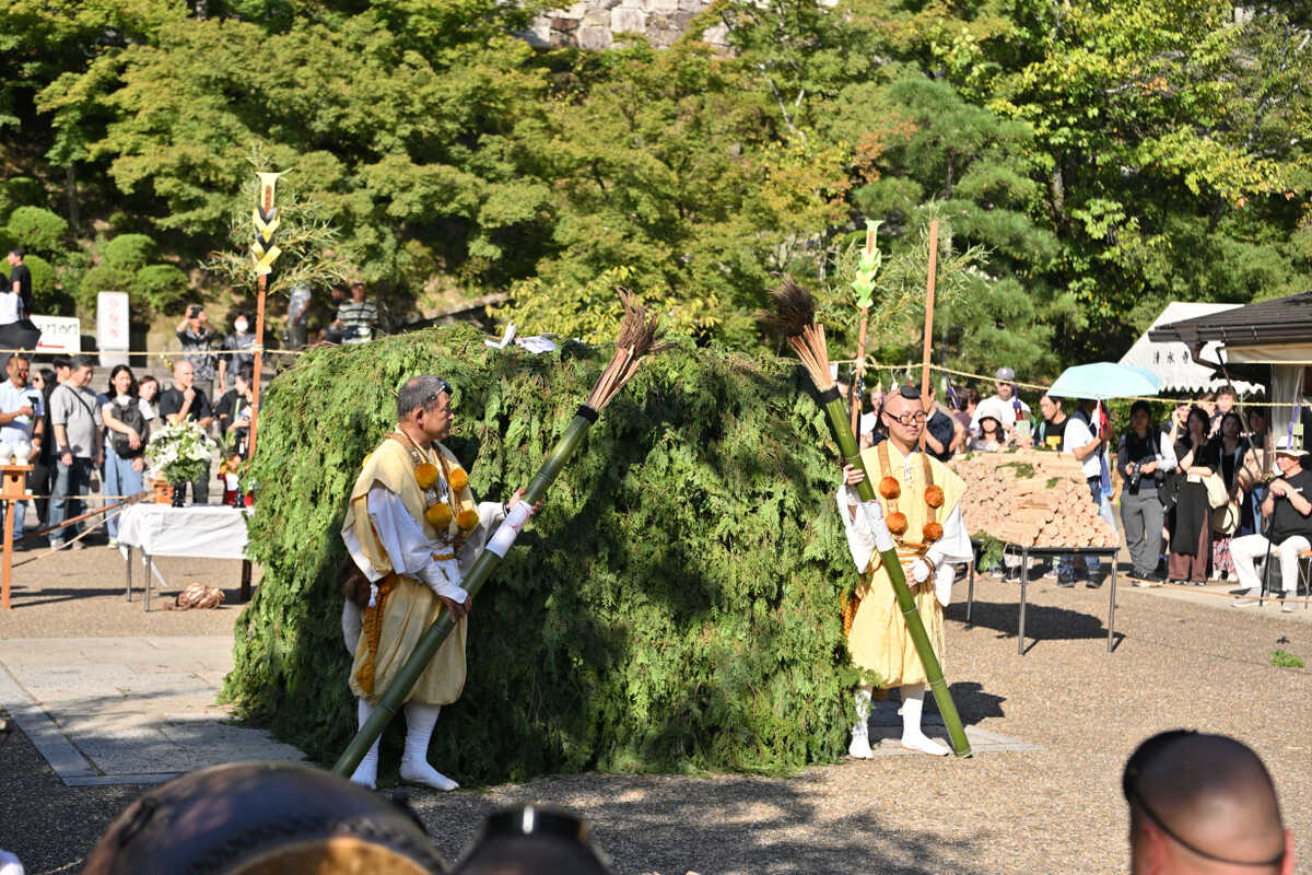 火がくべられる護摩壇は清水寺・仁王門の南にある、南苑に設けられていました。井桁に組まれた長さ2m程度の丸太をヒノキ科の樹木・ヒバの葉でこんもりと覆い尽くしたもので、高さは男性の背丈以上。