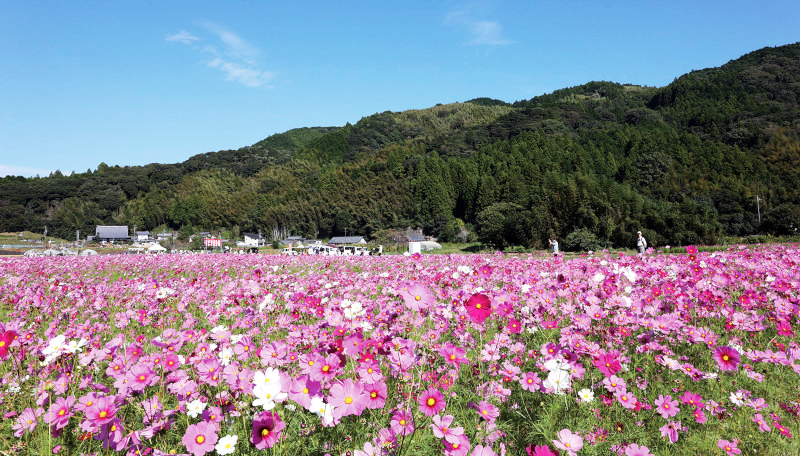 藤枝市「玉露の里」に程近い、広大な約3万平方メートルの休耕田に広がるコスモス畑。周囲を山に囲まれた自然豊かな場所で、のんびりとした秋の時間を過ごせます。