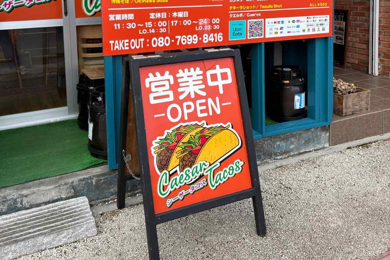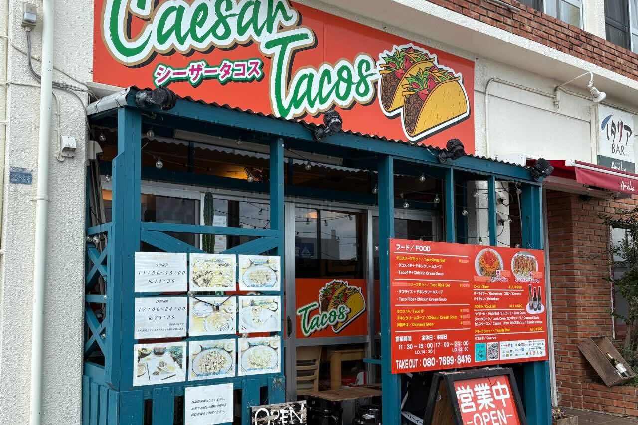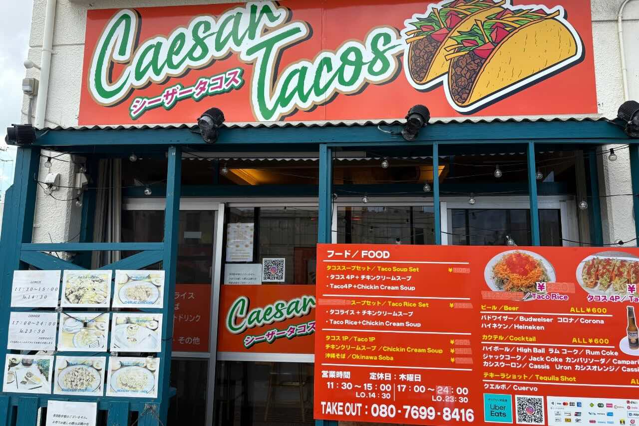 うるま市石川の石川池原線沿いに、小さいながらも目を引くメキシカンな外観のお店「CaesarTacos(シーザータコス)」があります。 看板には大きなタコスの絵、店先には沖縄そばののぼり旗。まるで相容れなさそうなふたつの料理がならぶお店に、好奇心を抑えきれず足を踏み入れました。