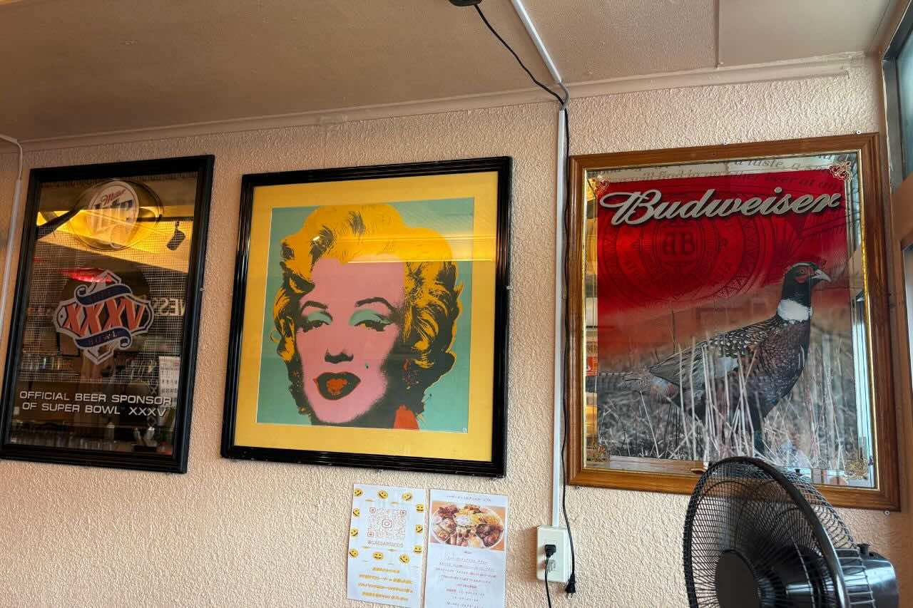 壁にはポップアートや海外ポスター。牛のツノに「Aサインバー」を思わせる飾り付けもあり、アメリカ統治時代のような雰囲気を感じさせます。