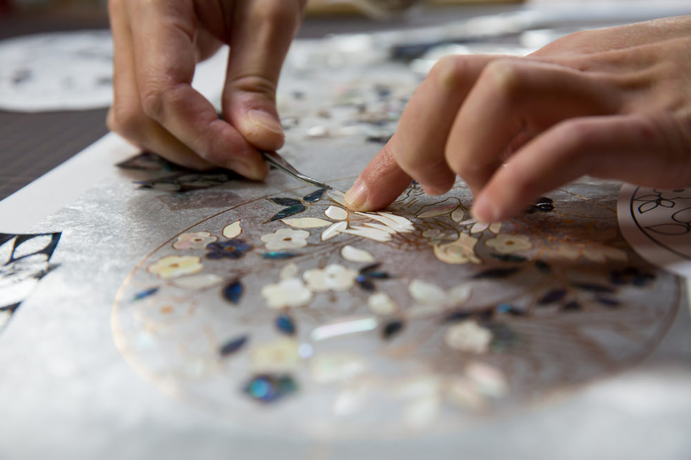 まず硬い貝殻を、0.1-0.2ミリの薄さに削り出し、図柄に沿って切り出した上、和紙に張り付けていく。柄完成後、それをさらに0.6mm程度の平糸状に裁断し、貝殻が剥離しないよう、また、柄がきれいに揃うように細心の注意を払いながら絹糸と共に一本一本織り進めていくという極めて繊細で慎重な作業が行われる。