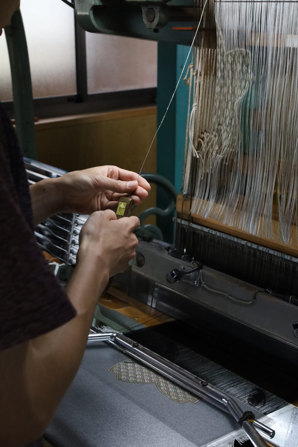 「螺鈿糸は非常にデリケートで、織る際に経糸に引っかけて破損させてしまうことがある。その日の湿度や温度に合わせて、材料への影響や、経糸と緯糸の張力バランスなど、全てを完璧に調整しなければ、この生地は生まれない」。それは、伝統的な西陣織の技術を土台としながらも、長年の試行錯誤の末にたどり着いた、まさに職人魂の結晶であった。