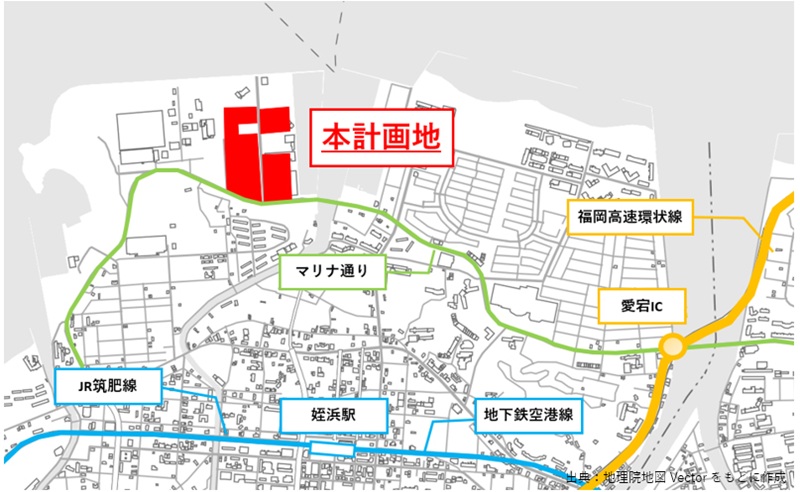 「(仮称)三井アウトレットパーク福岡」計画地は幹線道路の「マリナ通り」に面しており、福岡高速環状線の「愛宕」ICから約2キロと、車でのアクセスが非常に便利です。