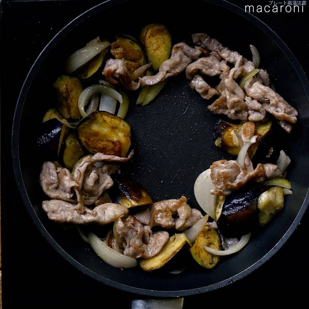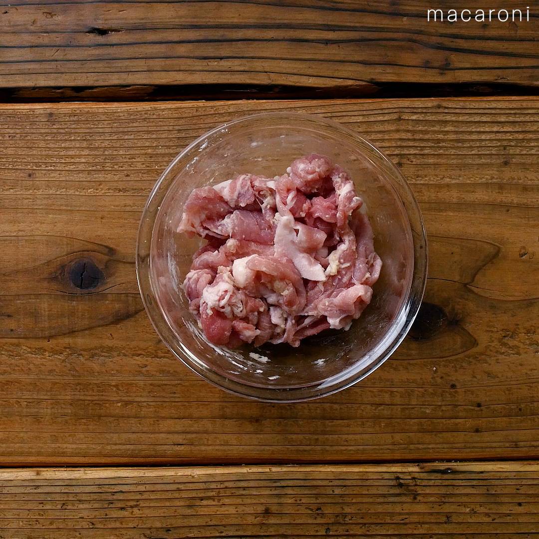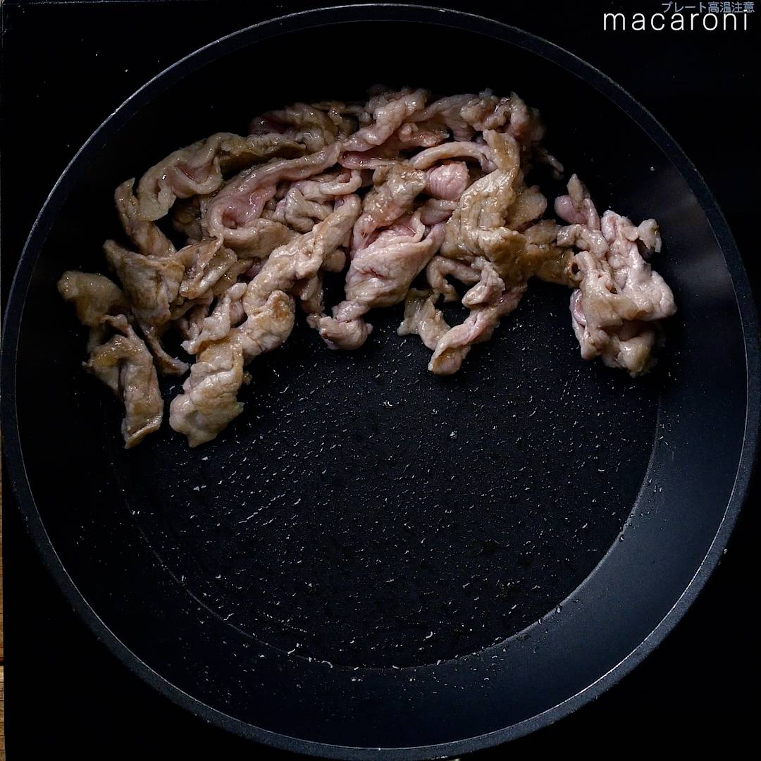 3: フライパンにごま油を引いて中火で熱し、豚こま肉を加熱します。