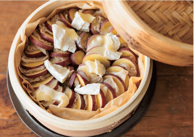 2 クッキングシートを敷いたせいろの縁に沿って円を描くように、さつまいも、豚肉を交互に重ねる。ふたをして中強火で15 分蒸す。