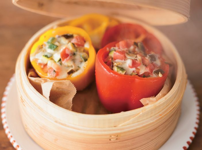 4 クッキングシートを敷いたせいろに3を入れ、スライスチーズを2 切れずつのせる。空いているところに飾り用のパプリカを詰め、ふたをして中強火で10 分蒸す。