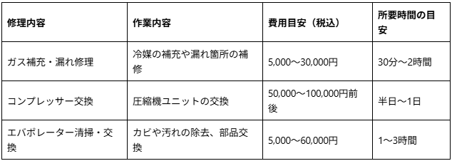 ただし、コンプレッサー交換や電装系の故障など、複雑な修理は対応外になる場合があります。