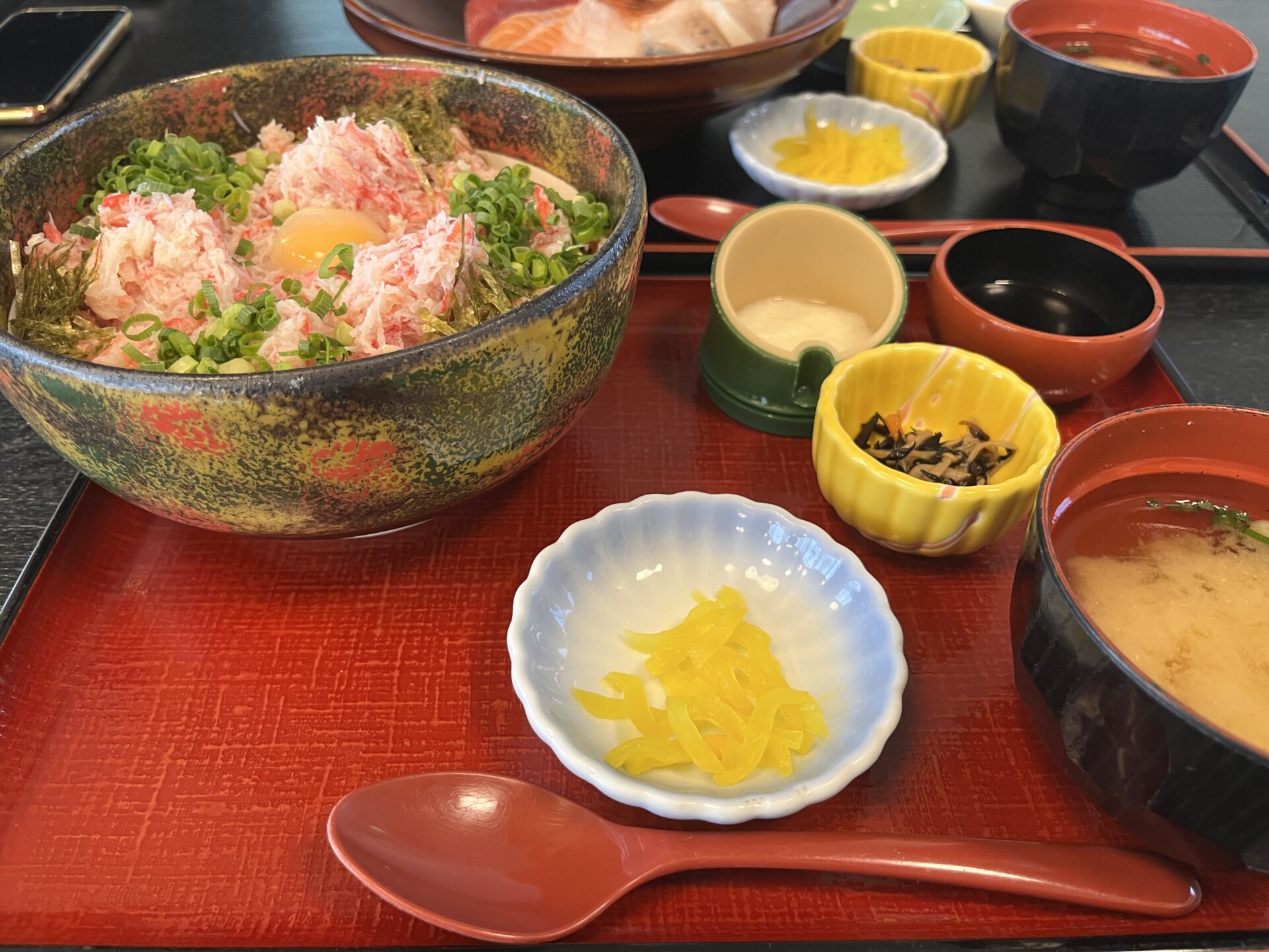 鮮やかな赤いカニの身に、卵黄やネギ、長芋、特製だれの色合いが加わり、見ているだけで思わず笑顔になる豪華なビジュアルです